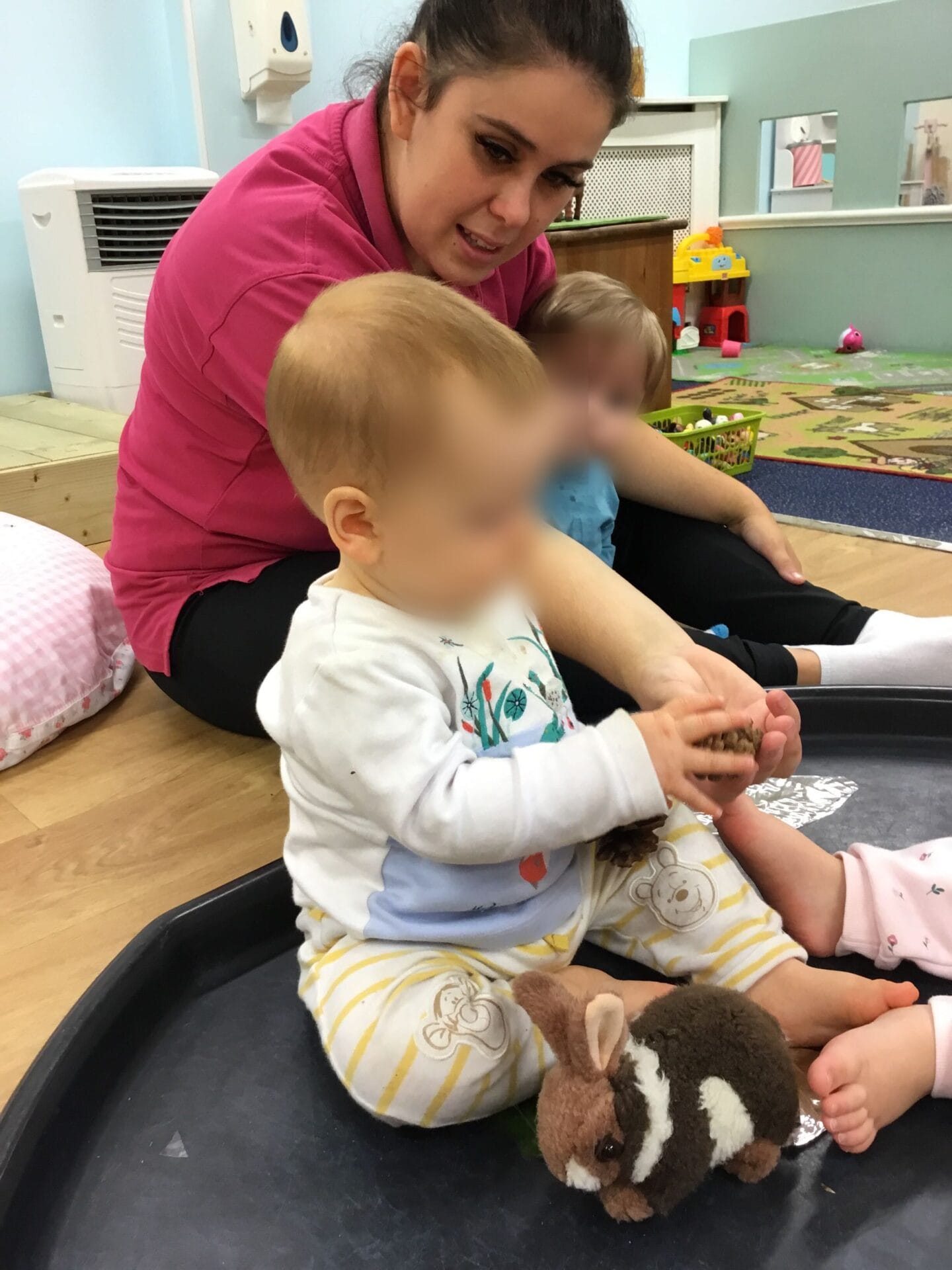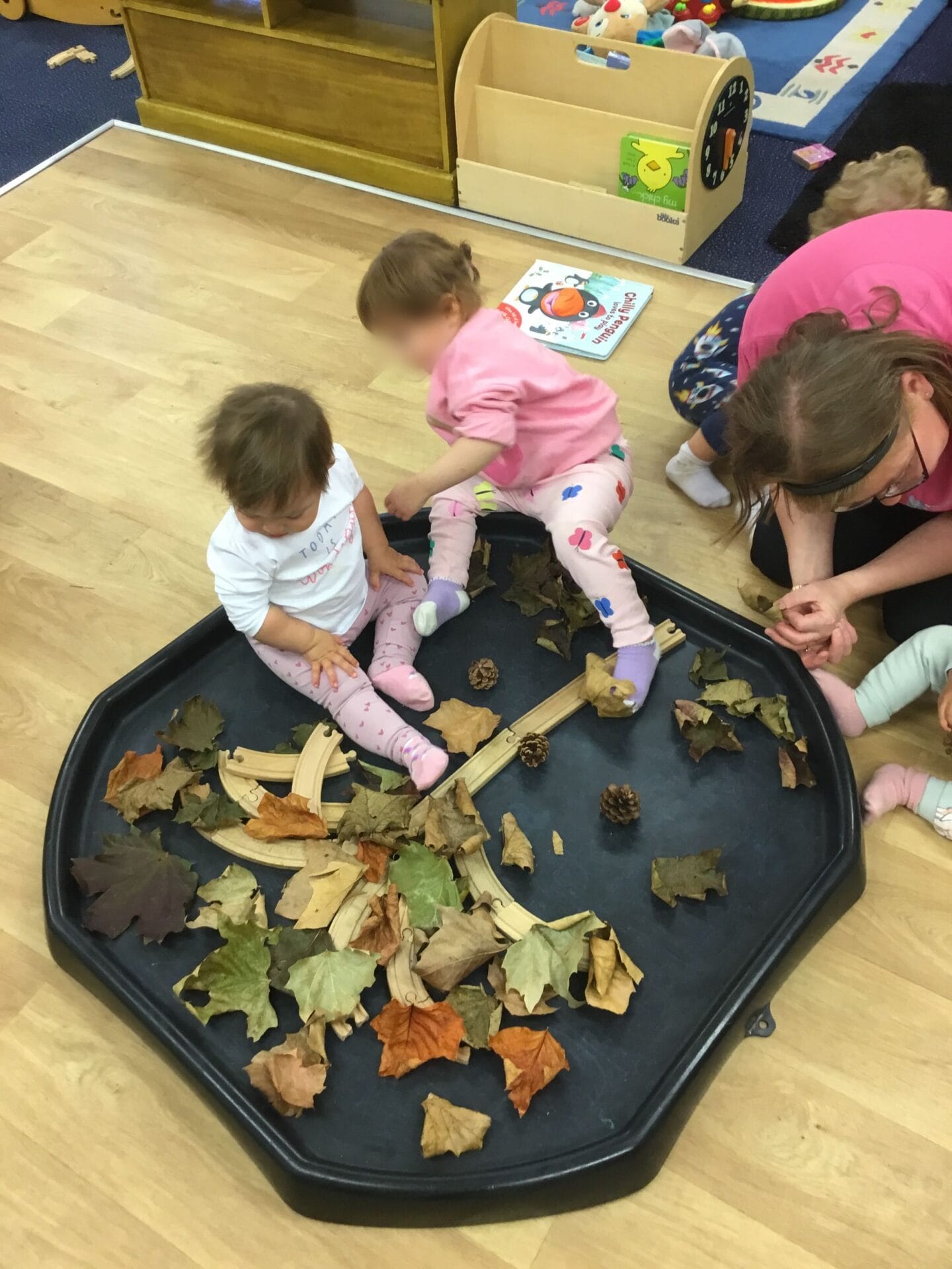 The babies have explored the train track as a tree and felt the rustling leaves on the tray to explore and feel the different textures.