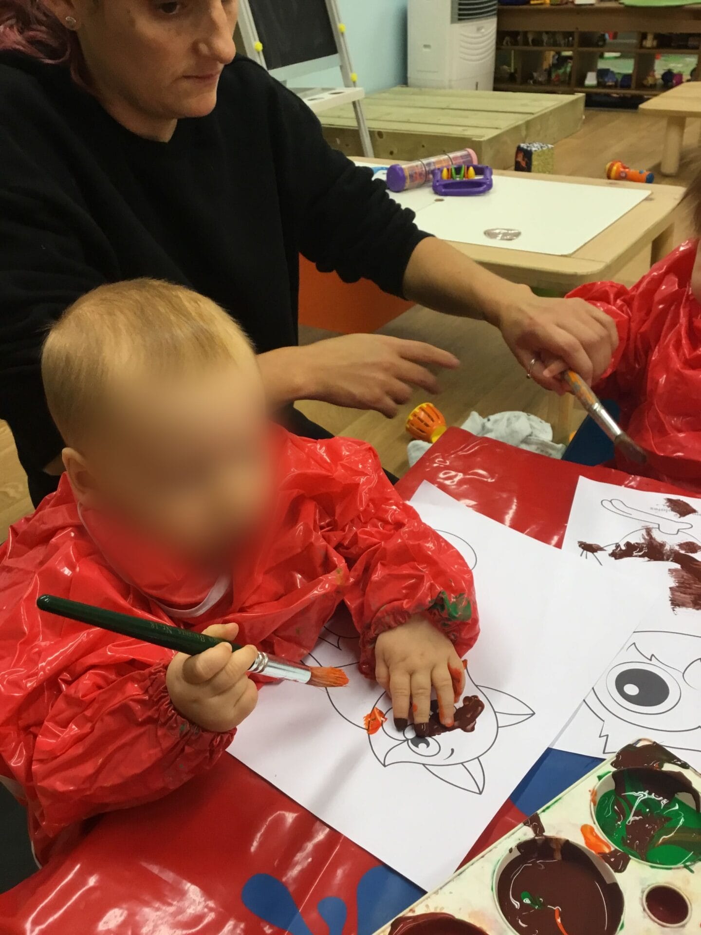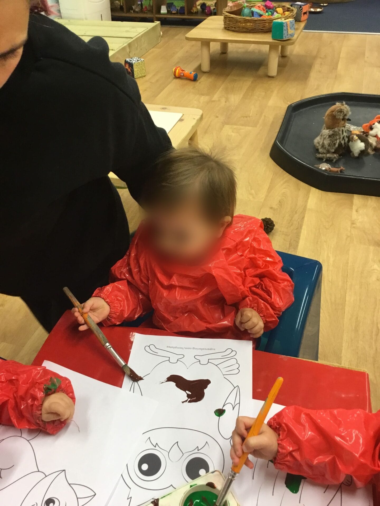 Babies have been exploring autumn using the colour brown. The children explore the tuff tray with autumn animals, pine cones also leaves to feel the different materials and fabric to touch and explore. The babies painted autumn animal pictures choosing a hedgehog, squirrel, fox, owl to make marks on the animals using brown, orange.