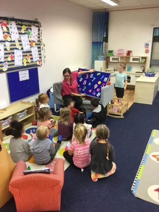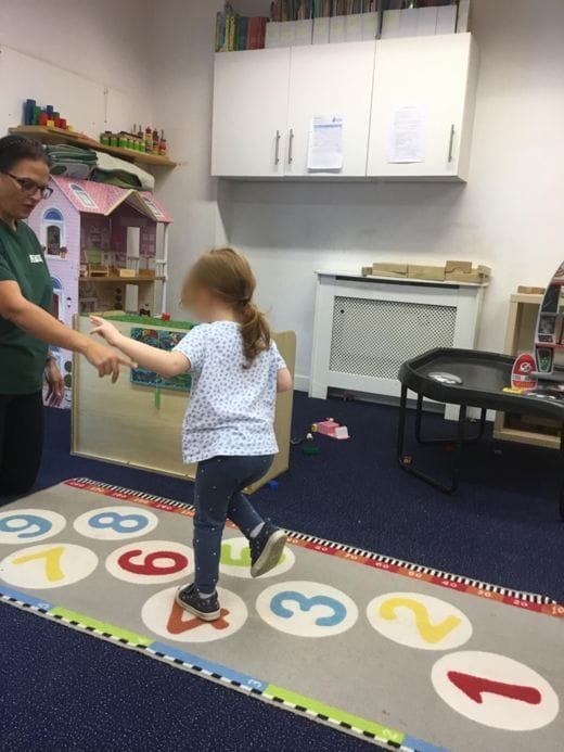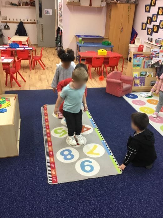 We decided to work on our maths knowledge. We provided plenty of opportunities for children to engage with resources that encourage maths language and for adults to extend on this. We recently bought a new mat which the children enjoyed using to play hopscotch and name the numbers as they go.